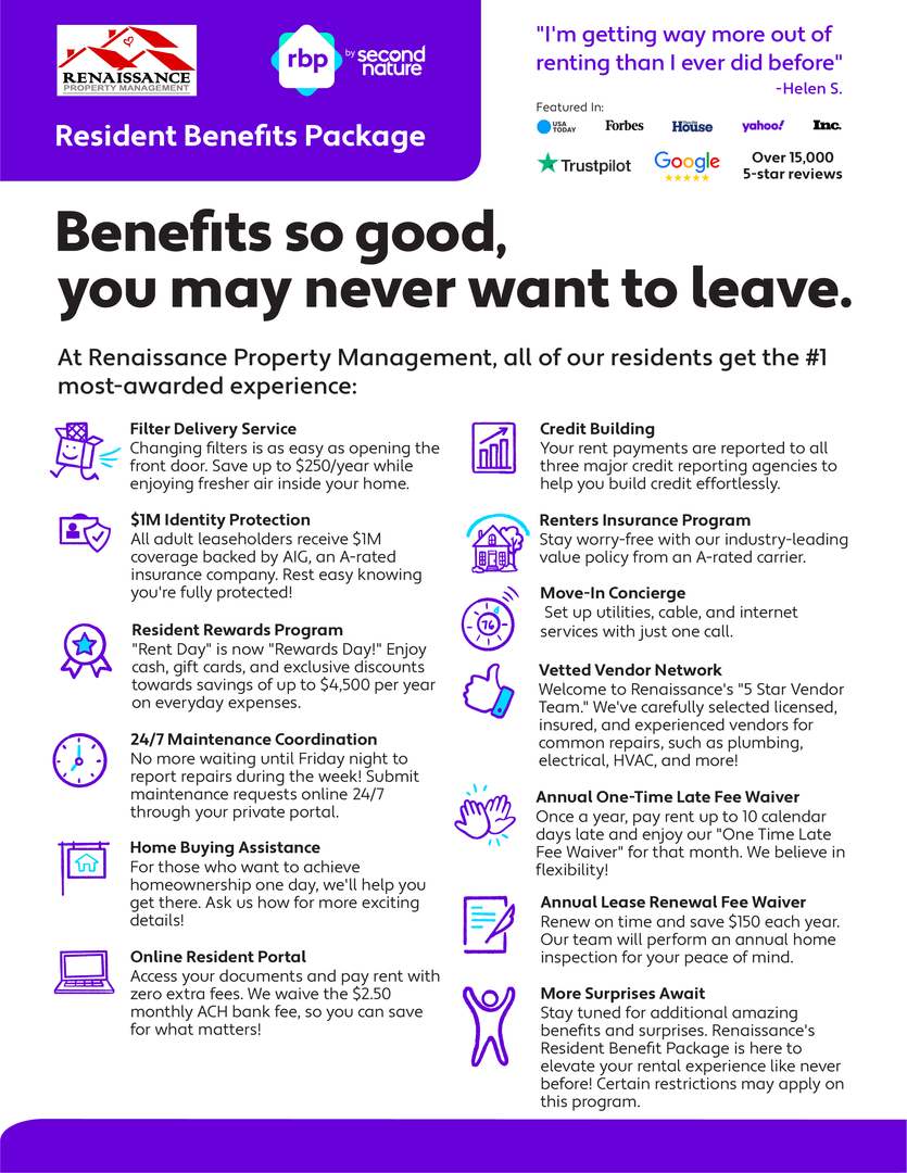 All Renaissance Property Management residents are enrolled in the Resident Benefits Package (RBP) for $50.95/month which includes liability insurance, credit building to help boost the resident’s credit score with timely rent payments, up to $1M Identity Theft Protection, HVAC air filter delivery (for applicable properties), move-in concierge service making utility connection and home service setup a breeze during your move-in, our best-in-class resident rewards program and much more! More details upon application.