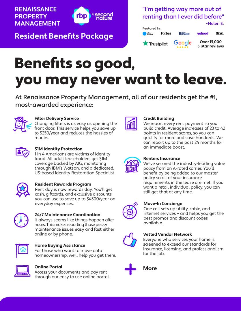 All Renaissance Property Management residents are enrolled in the Resident Benefits Package (RBP) for $50.95/month which includes liability insurance, credit building to help boost the resident’s credit score with timely rent payments, up to $1M Identity Theft Protection, HVAC air filter delivery (for applicable properties), move-in concierge service making utility connection and home service setup a breeze during your move-in, our best-in-class resident rewards program and much more! More details upon application.